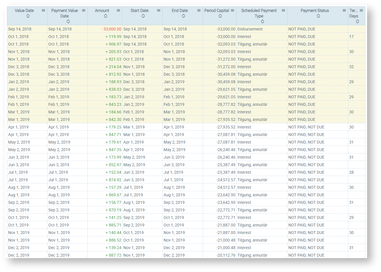 The amounts and dates for the payouts and repayments are presented in the payment plan.