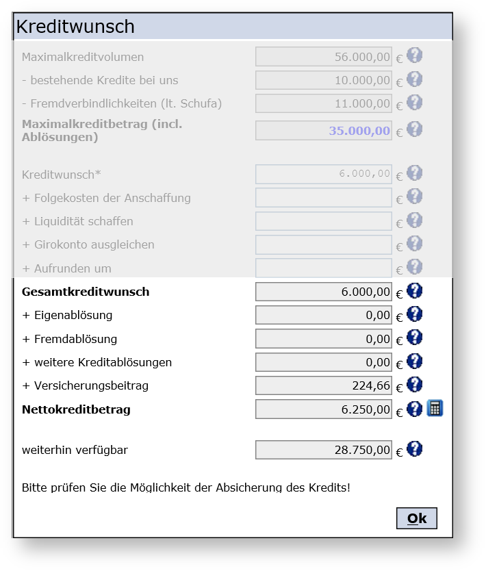 Beim Konsumentenkredit als Annuitätenkredit bietet der Kreditrechner eine hohe Flexibilität für eine optimale Konditionsberatung des Kreditnehmers. Denn für die Kreditberechnung kann entweder eine Ratenhöhe oder die Ratenanzahl/Laufzeit vorgegeben werden, der jeweils fehlende Wert wird berechnet.Gebühren und Provisionen