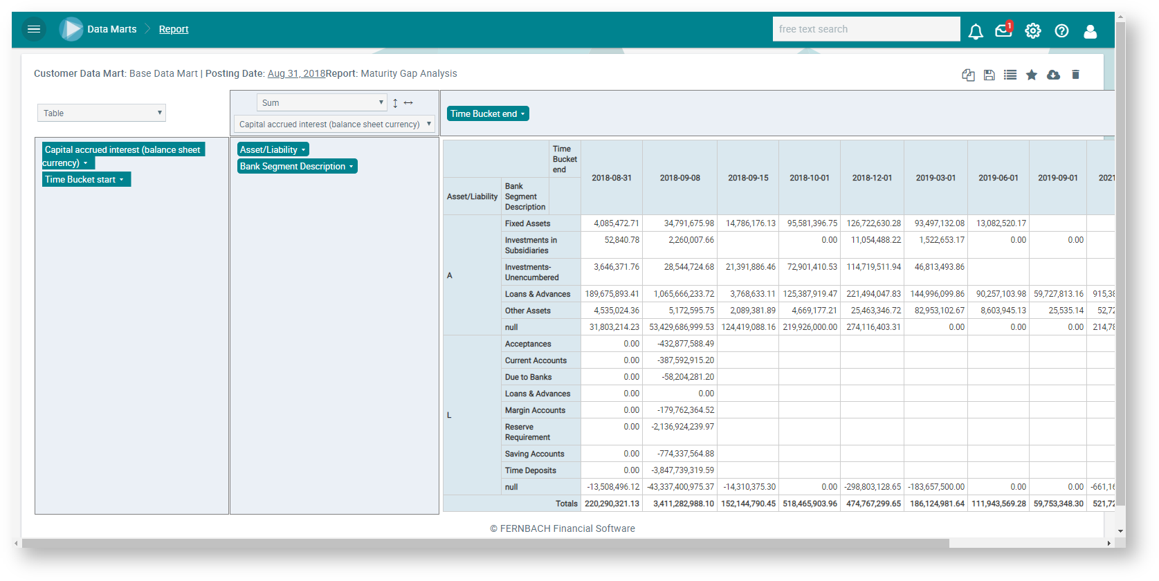 Es wird eine Liquiditätsablaufbilanz dargestellt, die die einzelnen Gaps (Ausgänge minus Eingänge) in Bilanzwährung pro Zeitraum einer definierbaren Zeitraumstaffel ausweist. Es erfolgt dabei eine Gruppierung nach ein oder mehreren Kriterien wie Aktiva/Passiva oder Bankensegment. Damit wird eine Übersicht über die Gesamtbank geschaffen, die die Verteilung der Gaps dann über die Aktiva und Passiva getrennt nach den Bankensegmenten darstellt.