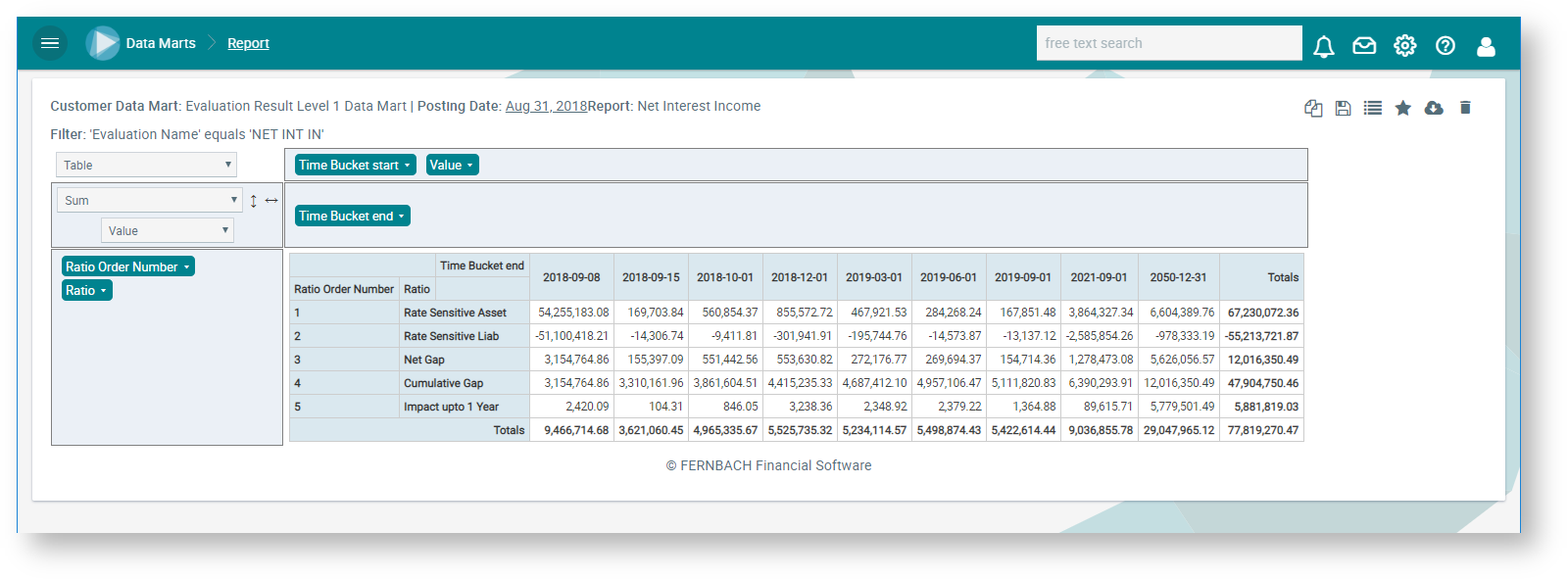 Basierend auf einem Portfolio wie Bankbuch oder Handelsbuch wird der Nettoertrag inkl. der Auswirkung eines 1%igen Schocks ausgewiesen. Dabei wird die barwertige Differenz zwischen Aktiva und Passiva pro Laufzeitband auch kumuliert dargestellt. Anschließend wird die Auswirkung der Änderung einer 1%igen Zinsänderung auf das Gap berechnet und entsprechend den Zinstagen der verwendeten Zeitraumstaffel ausgewiesen. Die Marktdaten werden pro Buchungstag importiert und sind somit für den jeweiligen Buchungstag aktuell.