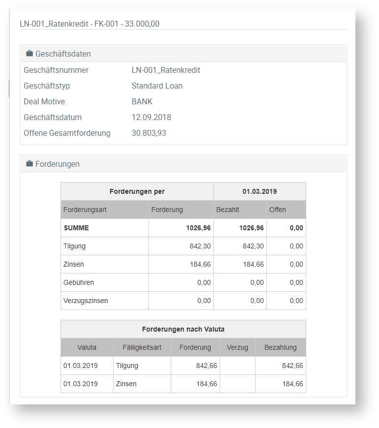 The current account balance with the outstanding claims can be displayed at any time for every type of receivable (capital, interest, charges, delayed payments).