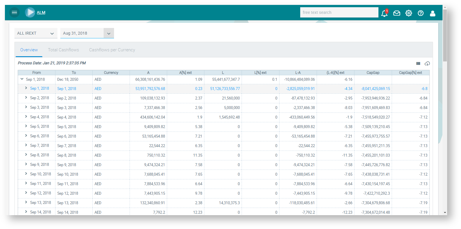 The assets, liabilities, asset/liability gap, the cumulative gap and the cumulative open gap are described for a portfolio such as the banking or trading book. The appropriate break-even rates (average interest rates or alternatively, returns) for the assets, liabilities, gap, cumulative gap and the open gap are also available. The display currency and the structure of the period grouping can be defined as required. Only capital payments are taken into account.
