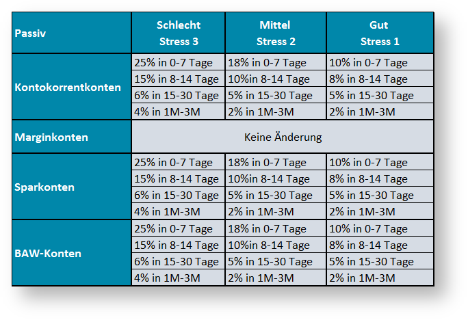 Damit werden für KK-Konten, Sparkonten und BAW Gelder unterschiedliche Höhen von Abflüssen je nach betrachtetem Szenario für einzelne Perioden (0-7 Tage, 8-14 Tage,...) angenommen.